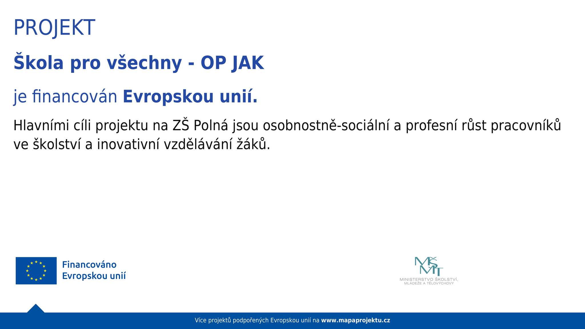 Hlavními cíli projektu OP JAK na ZŠ Polná jsou osobnostně-sociální a profesní růst pracovníků ve školství a inovativní vzdělávání žáků.