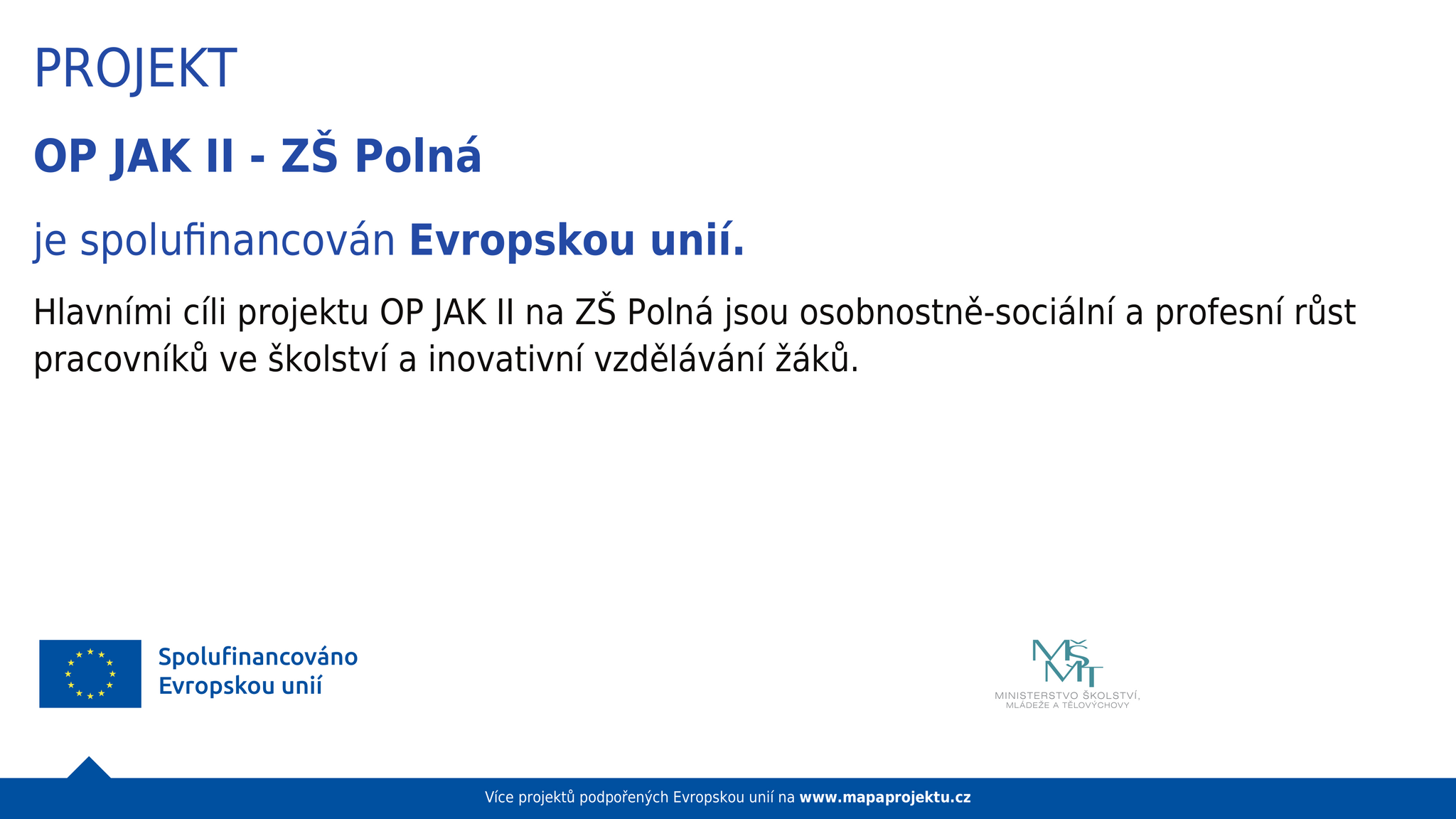 Hlavními cíli projektu OP JAK II. na ZŠ Polná jsou osobnostně-sociální a profesní růst pracovníků ve školství a inovativní vzdělávání žáků.